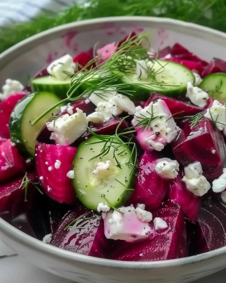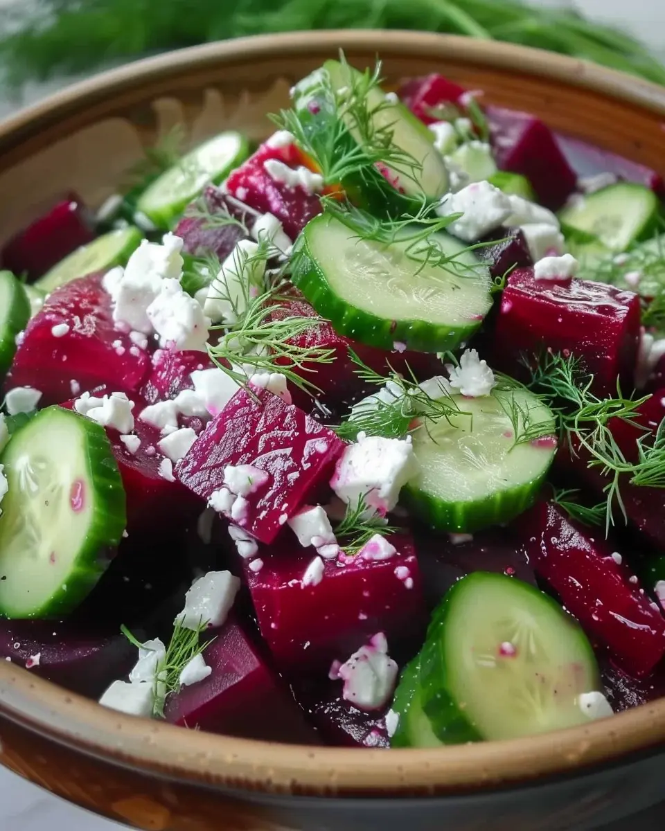 A refreshing and nutritious beet salad featuring feta cheese, crisp cucumbers, and fragrant dill, perfect for any occasion.