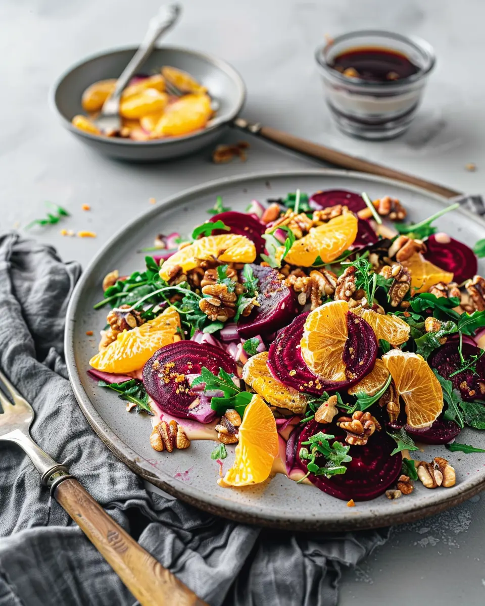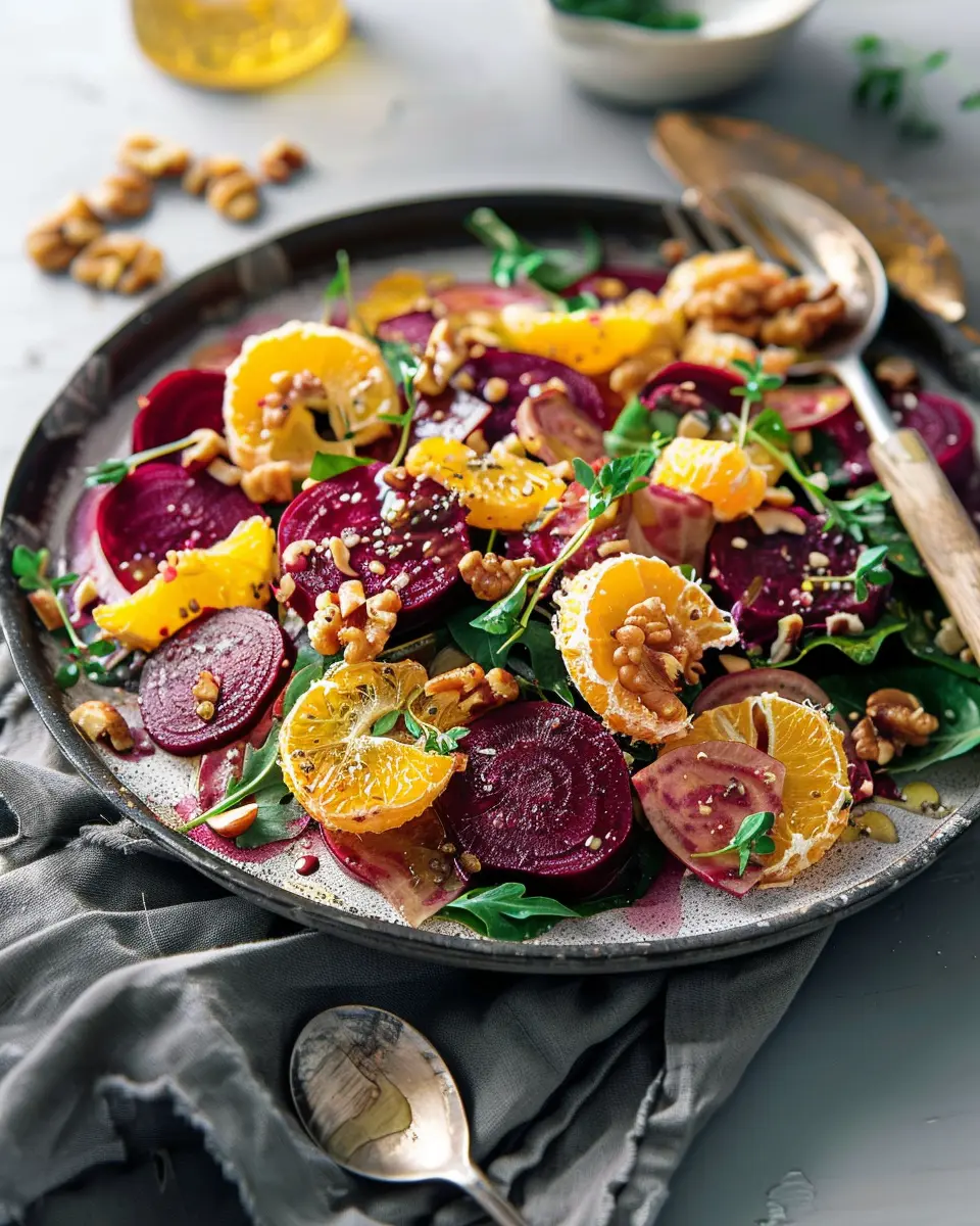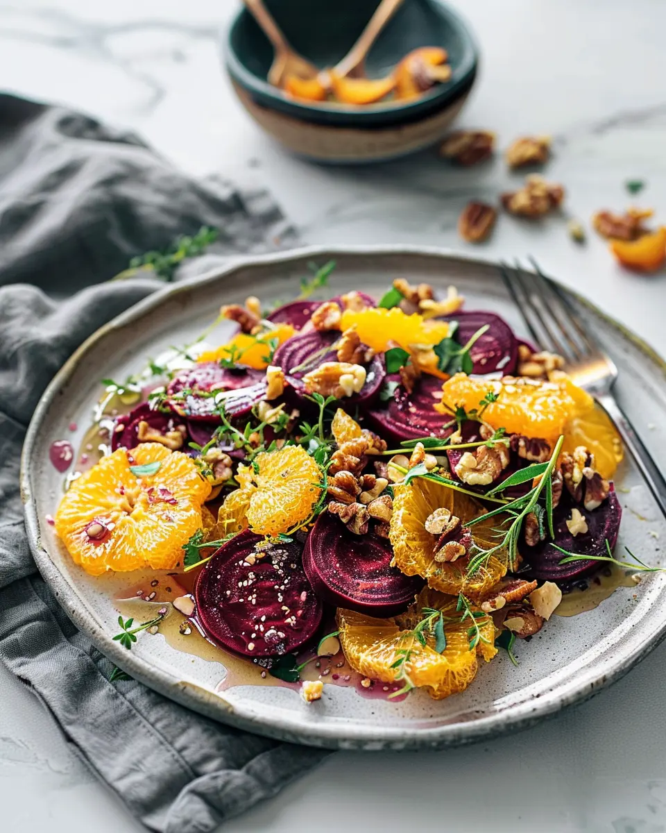 A refreshing and vibrant salad combining the earthiness of beets, the citrusy brightness of oranges, and the crunch of walnuts.