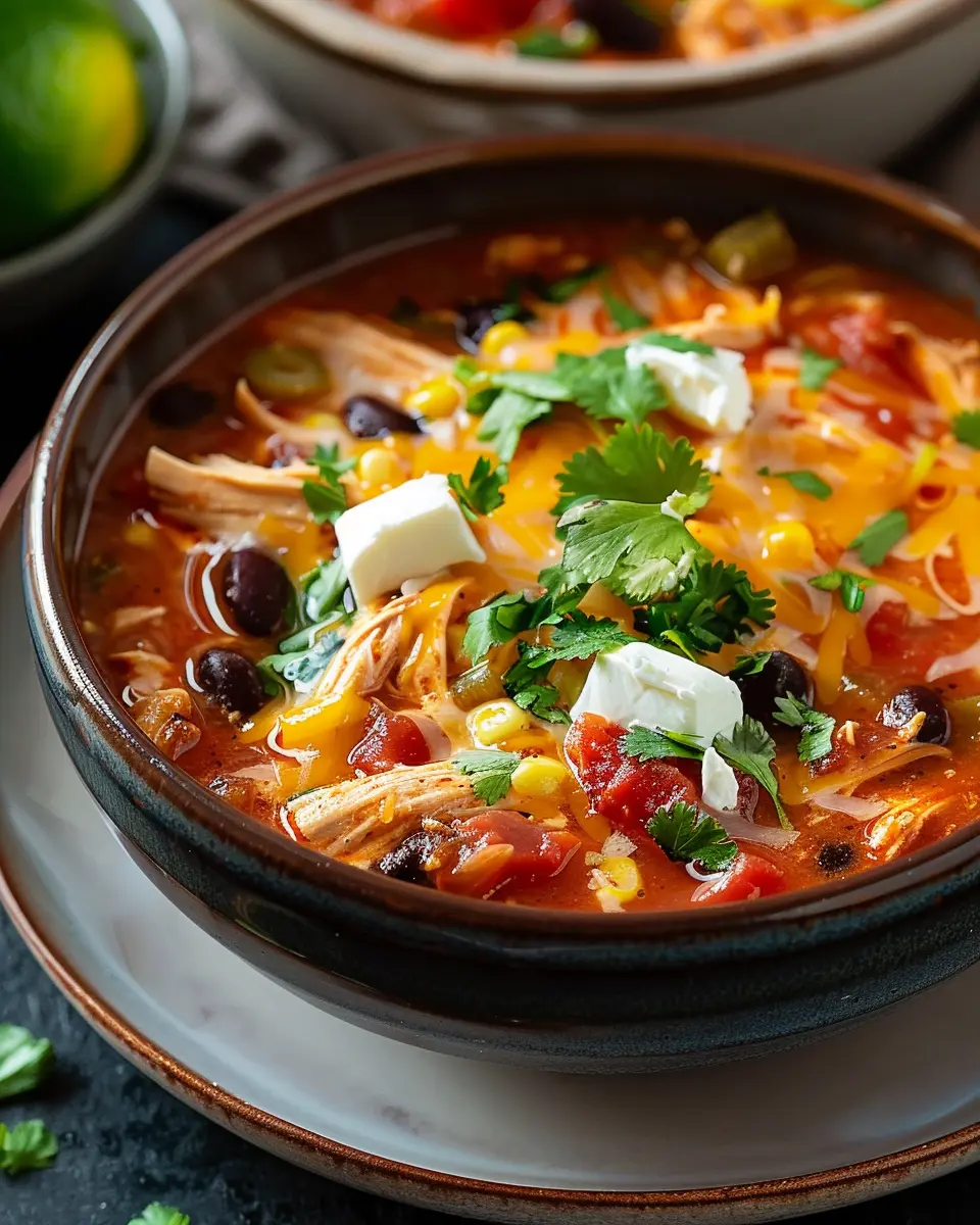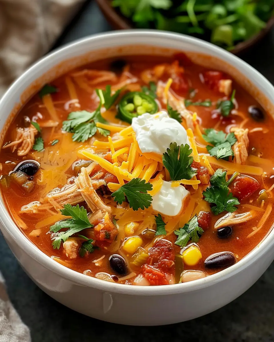 Enjoy a warm bowl of Chicken Enchilada Soup, perfect for chilly nights.
