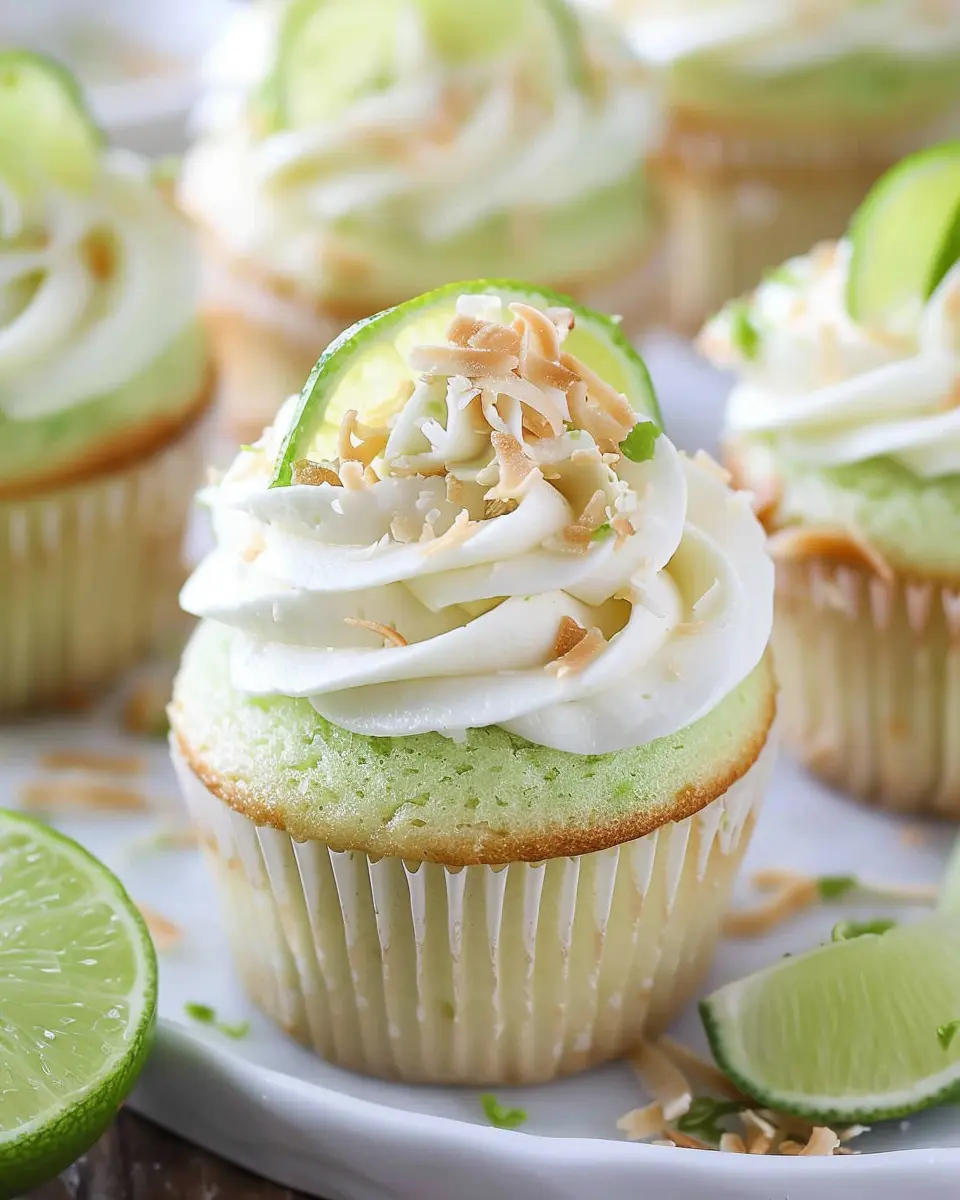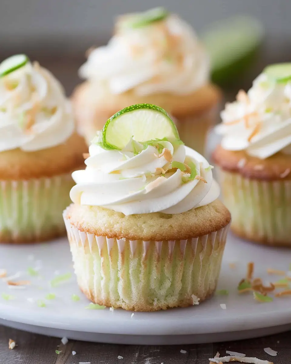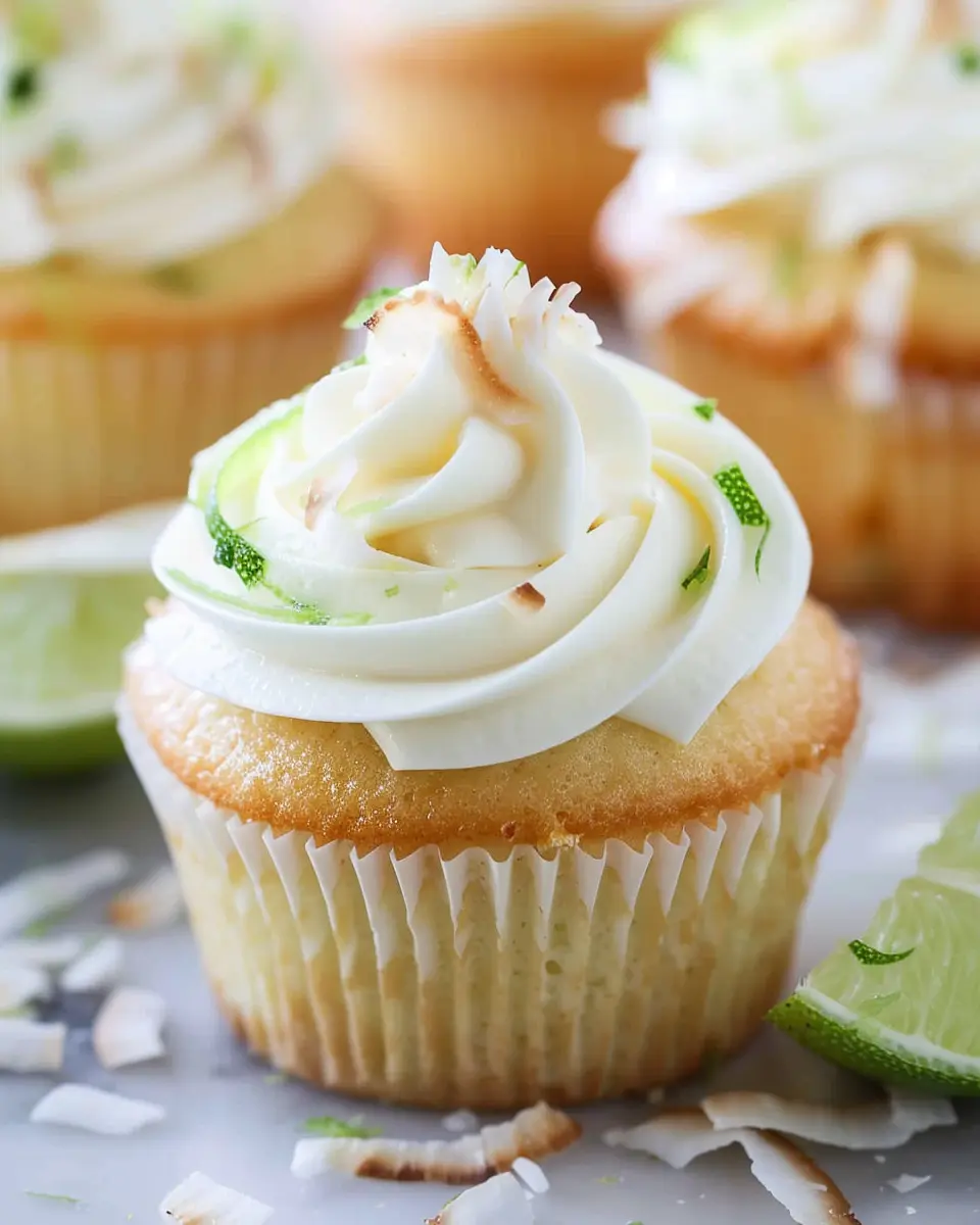 Delightful coconut cupcakes topped with zesty lime buttercream frosting for a refreshing treat.