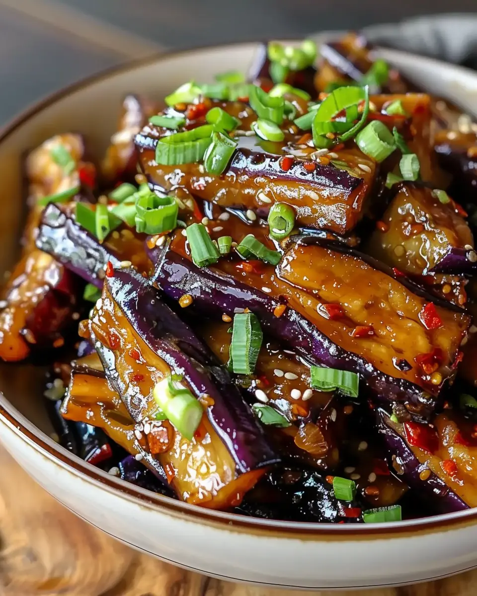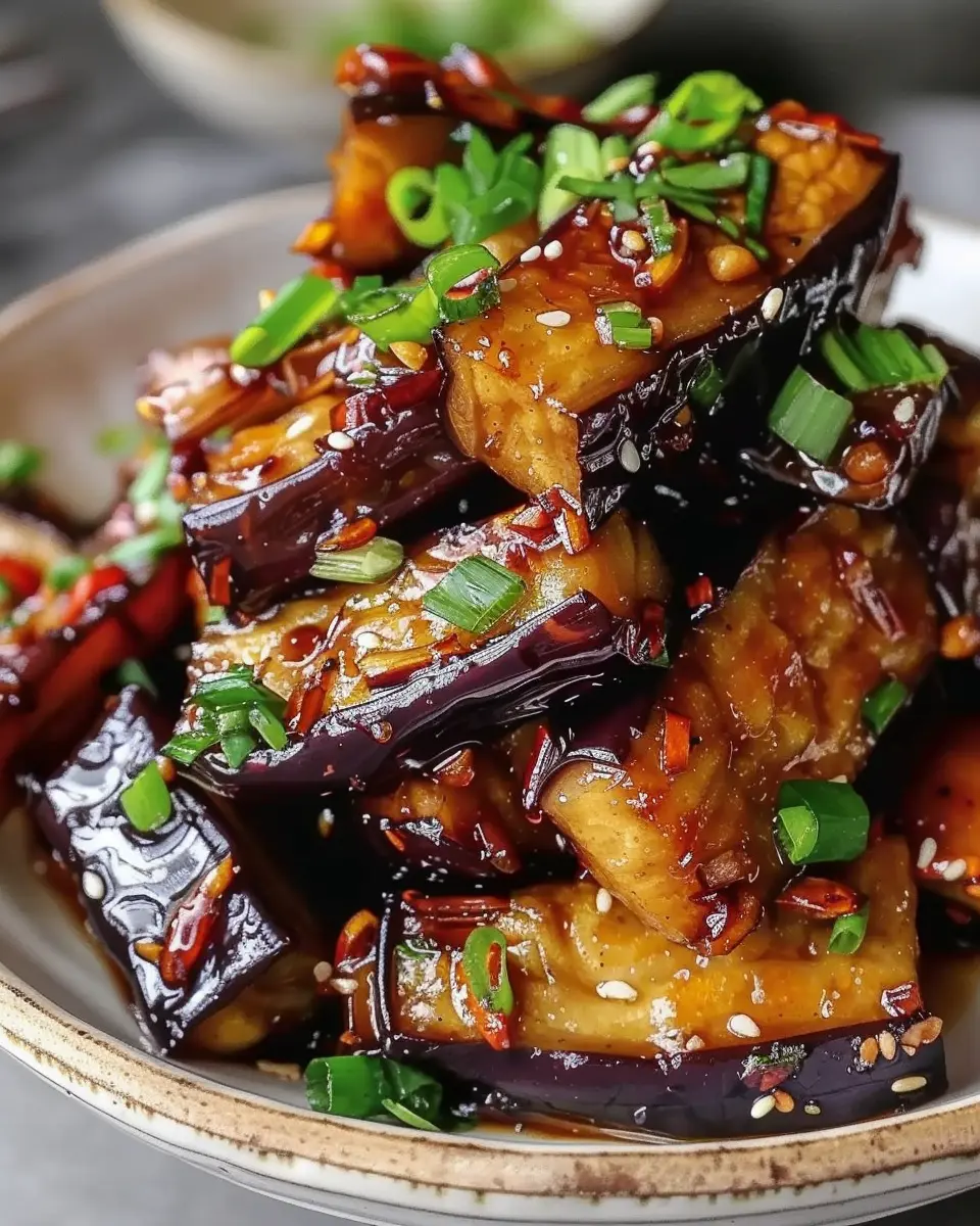 Feel free to garnish with green onions or sesame seeds for that extra touch. Serve immediately to enjoy the delightful contrast of the crispy eggplant and the rich glaze.