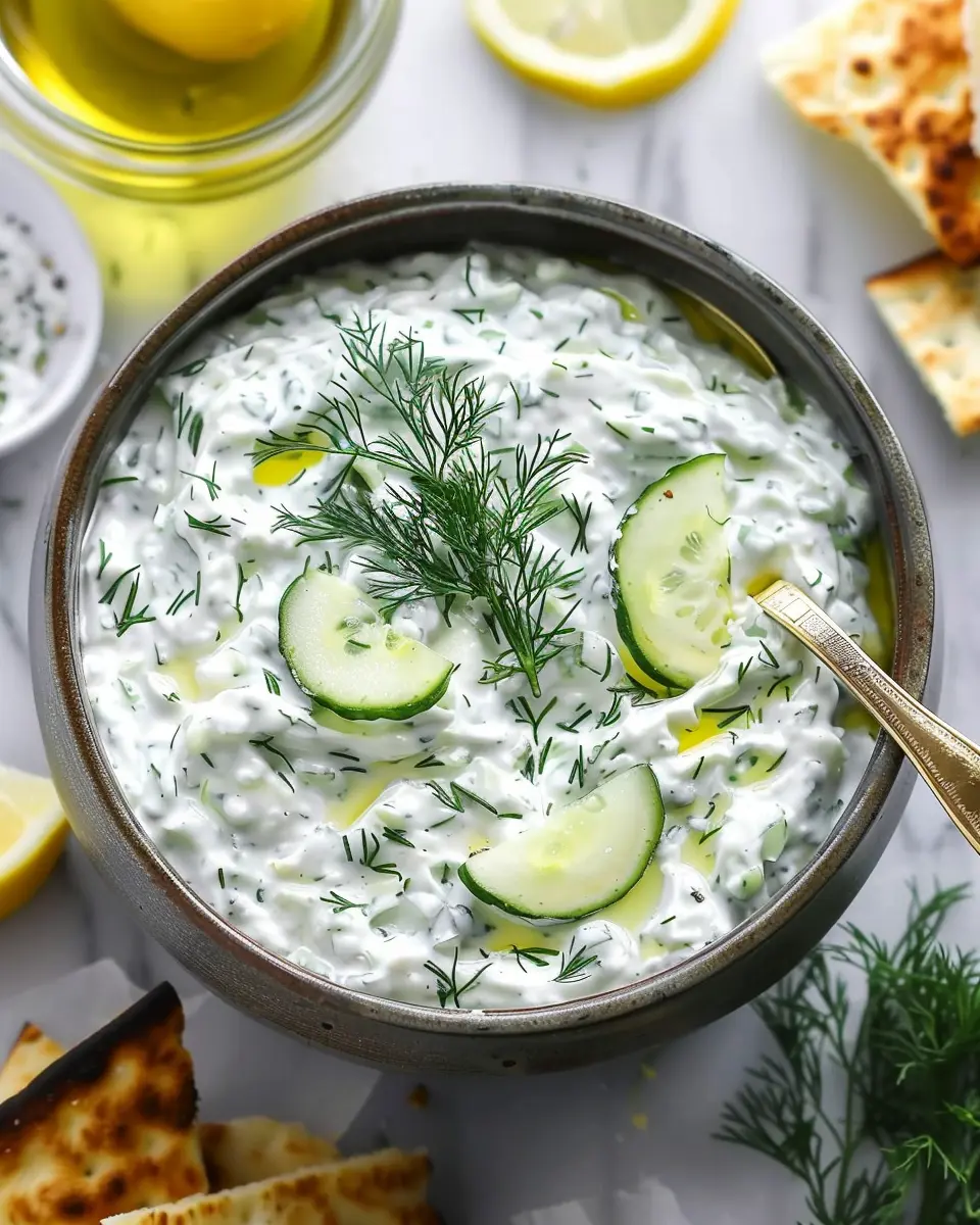 - In a mixing bowl, combine the Greek yogurt, grated cucumber, minced garlic, olive oil, lemon juice, and chopped dill.
