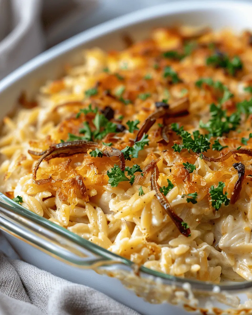 A delightful and comforting casserole that combines the rich flavors of French onion soup with tender chicken and orzo pasta.