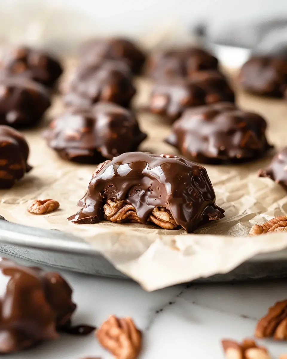 - Take the chilled pecan clusters and dip each one into the melted chocolate, ensuring they are well-coated.
