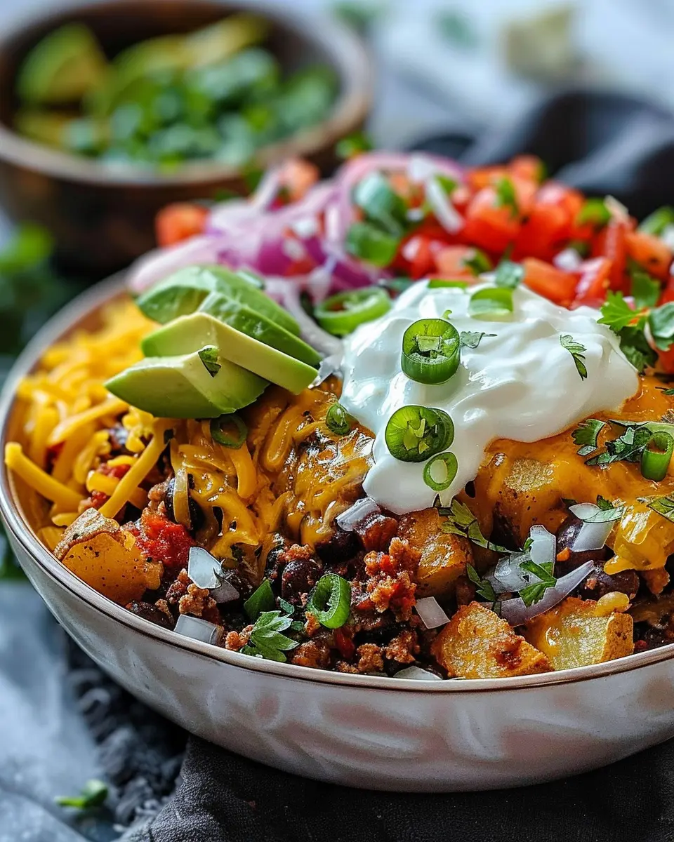 In total, you’re looking at approximately 40 minutes from start to finish. Not too bad for a meal that’s not only scrumptious but also hearty! Whether you’re enjoying a quiet dinner at home or prepping for guests, this loaded potato taco bowl will be a crowd-pleaser.