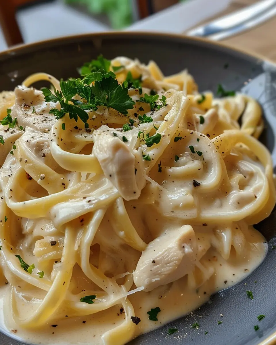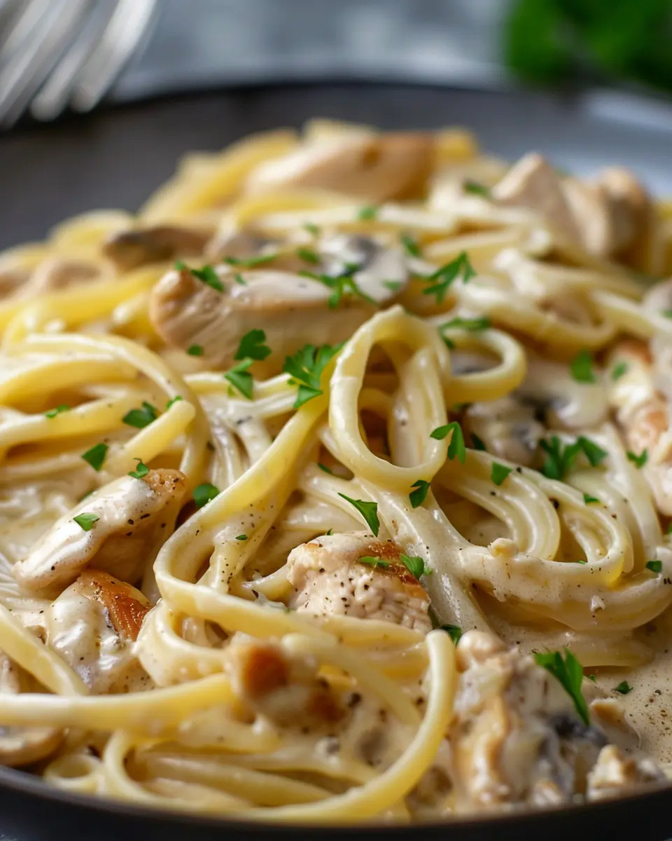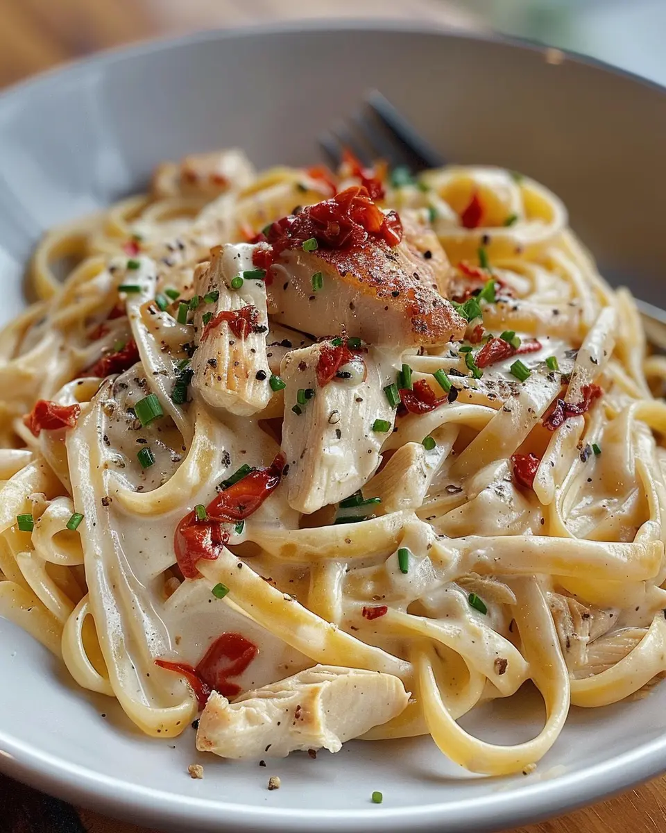 Finally, add the fresh spinach, tossing it gently until wilted. To serve, plate the pasta, top with the chicken, and showcase that beautiful creamy sauce. Garnish with a sprinkle of fresh herbs for that finishing touch.