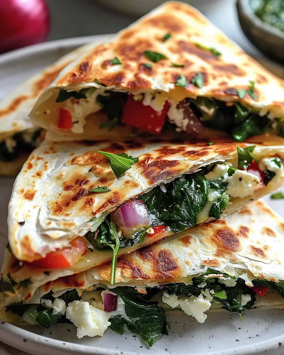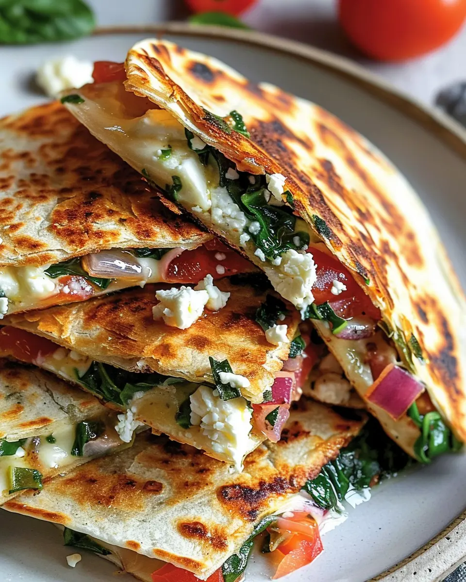 Indulge in the rich flavors of the Mediterranean with these easy spinach, feta, and mozzarella quesadillas. Perfect for a quick meal!