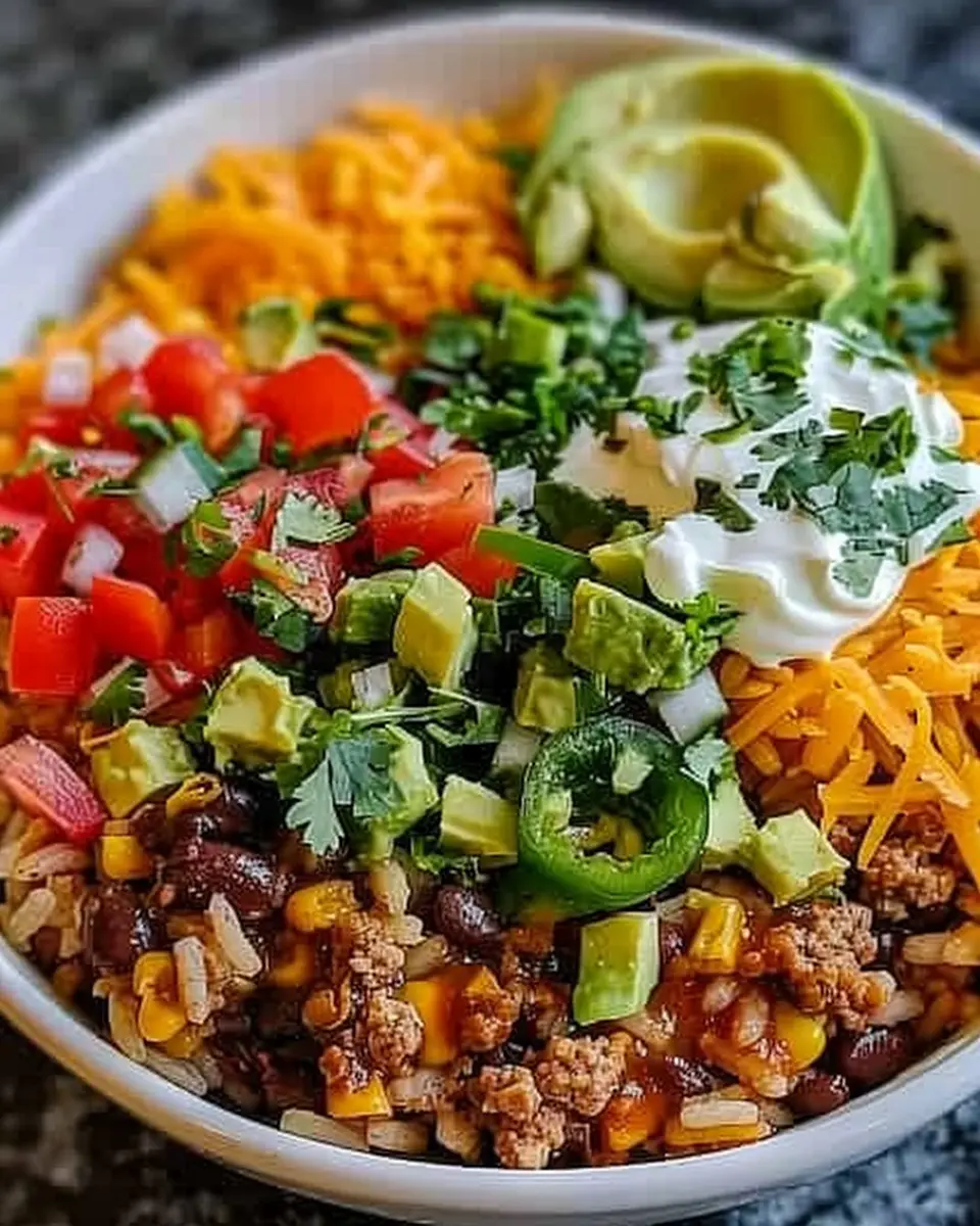 - Serve the mixture in bowls topped with shredded cheese, lettuce, diced avocado, and a dollop of sour cream.