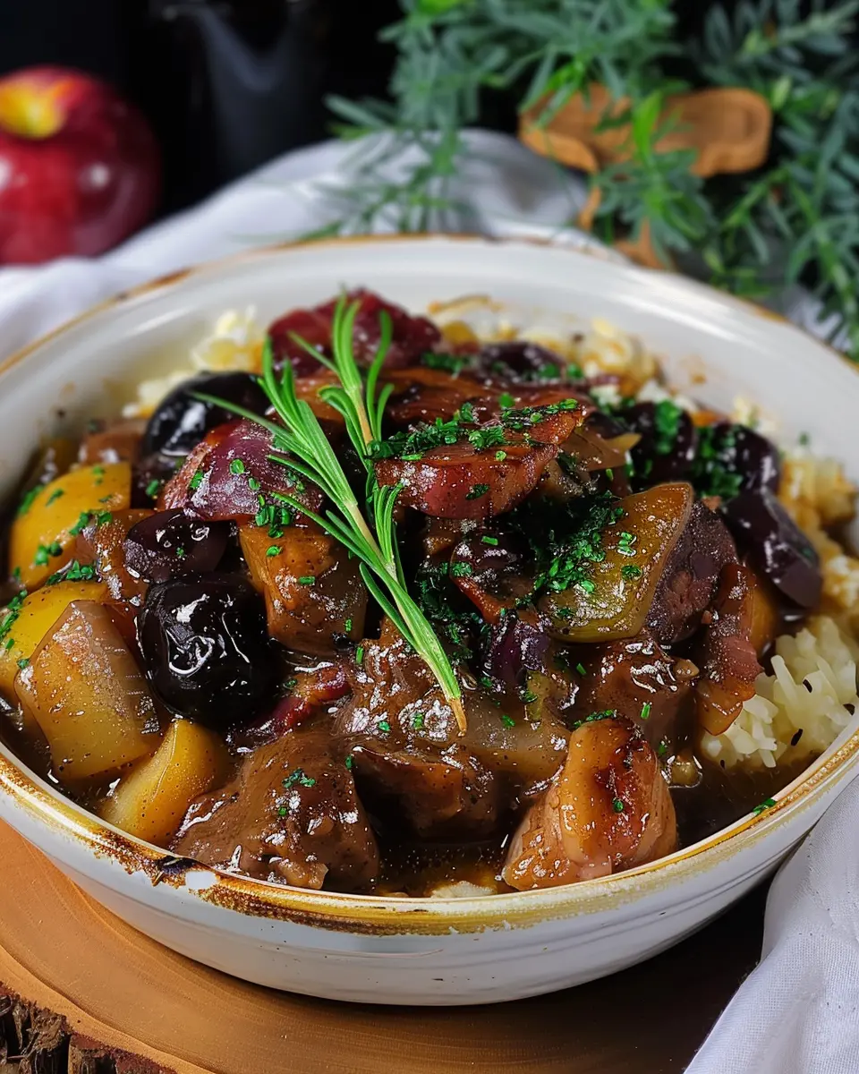 A hearty and comforting pork stew enriched with the savory flavors of turkey bacon, sweet apples, and decadent prunes.