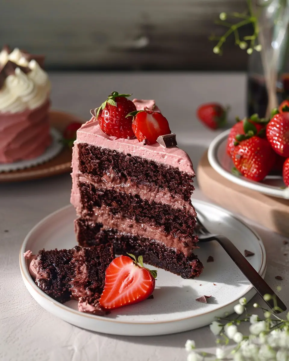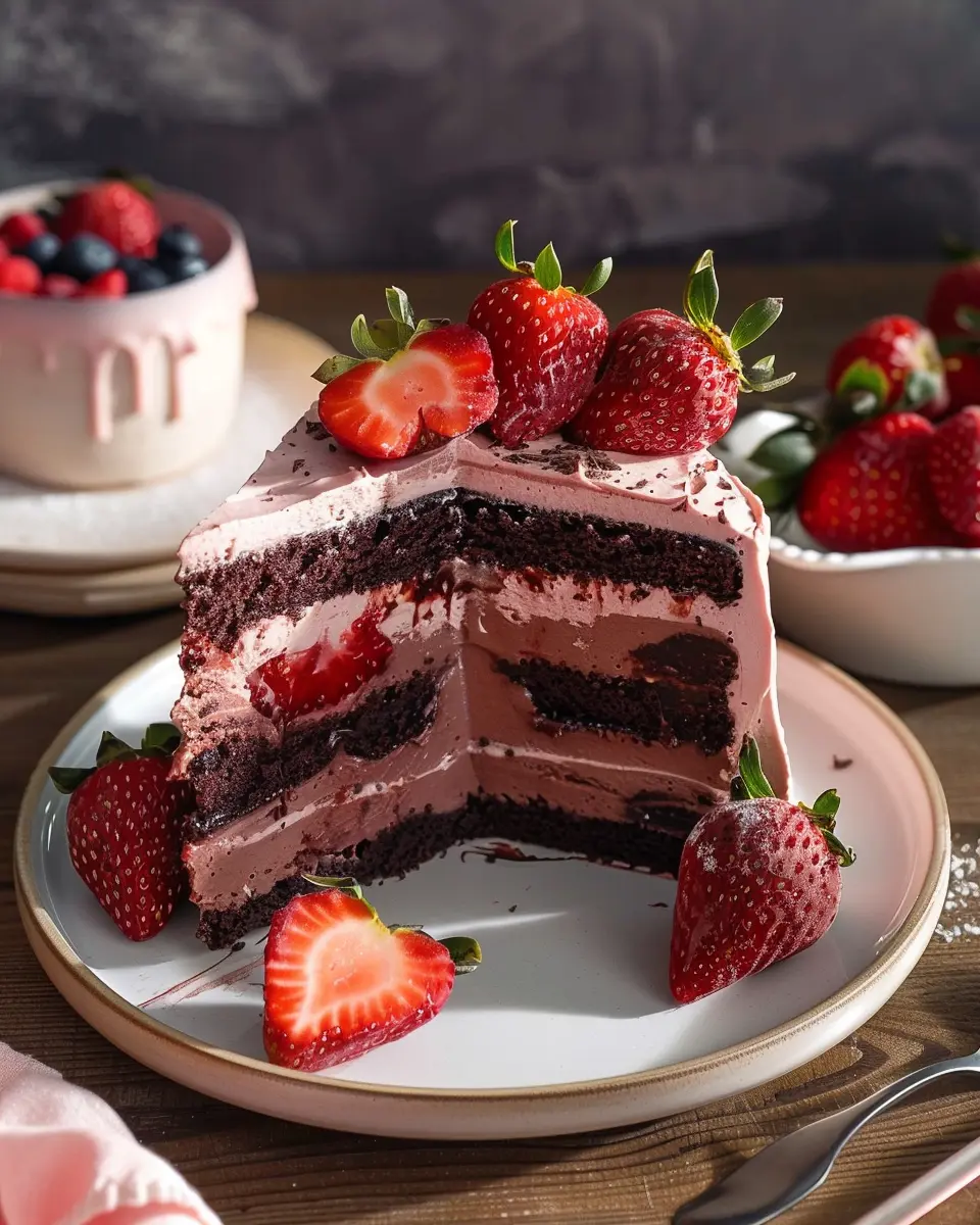 A deliciously indulgent strawberry chocolate cake that combines rich chocolate flavors with fresh strawberries, perfect for a special occasion at home.
