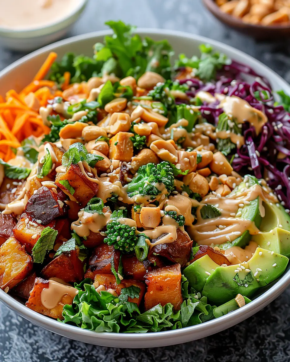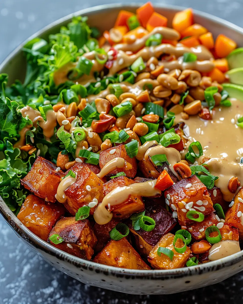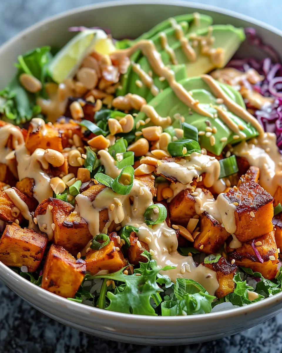 A delightful and easy-to-make Buddha bowl featuring the rich flavors of Thai peanut sauce and roasted sweet potatoes.