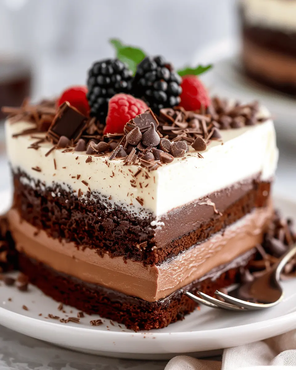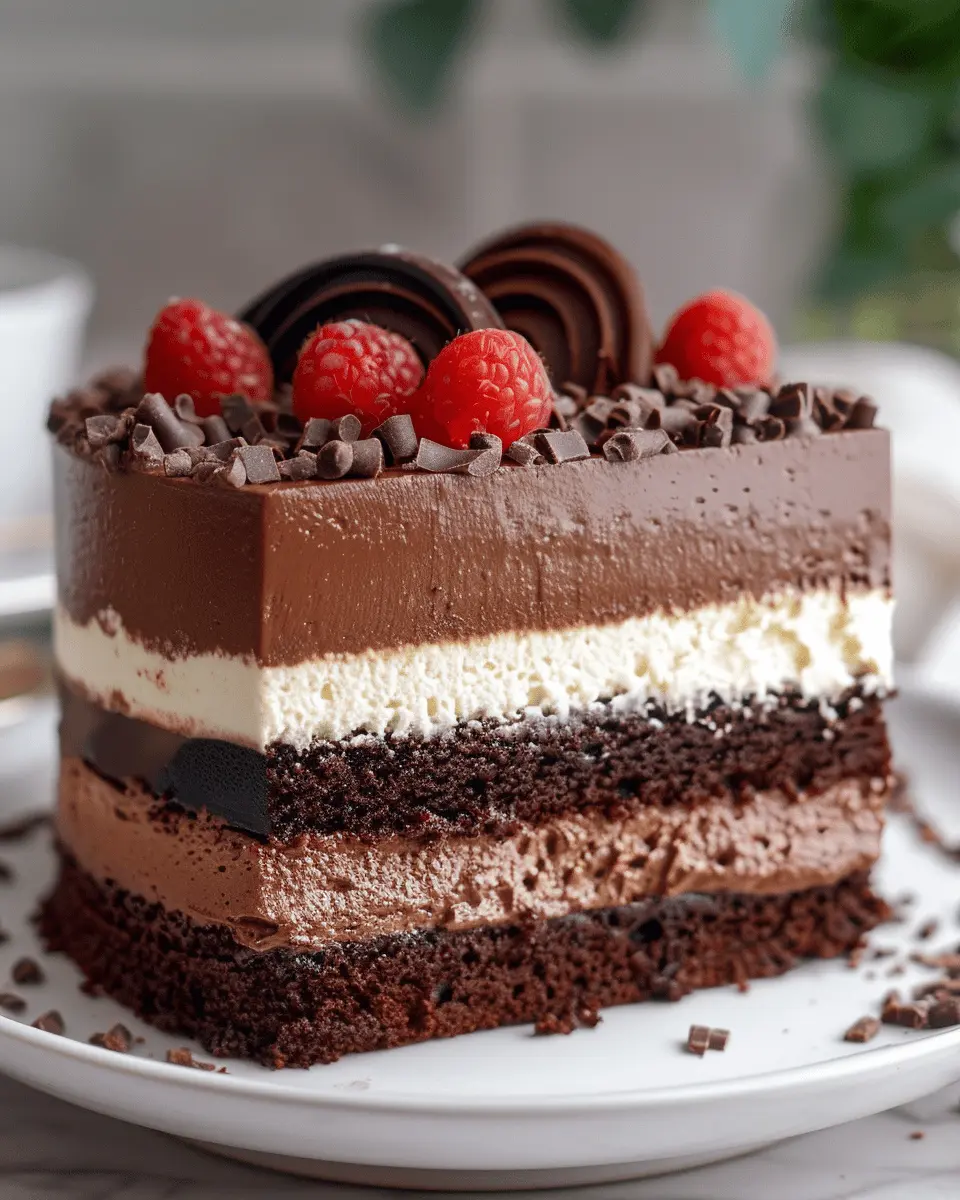 A rich and decadent dessert featuring layers of chocolate mousse and cake.