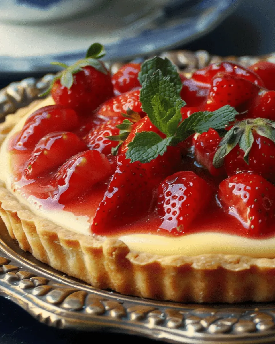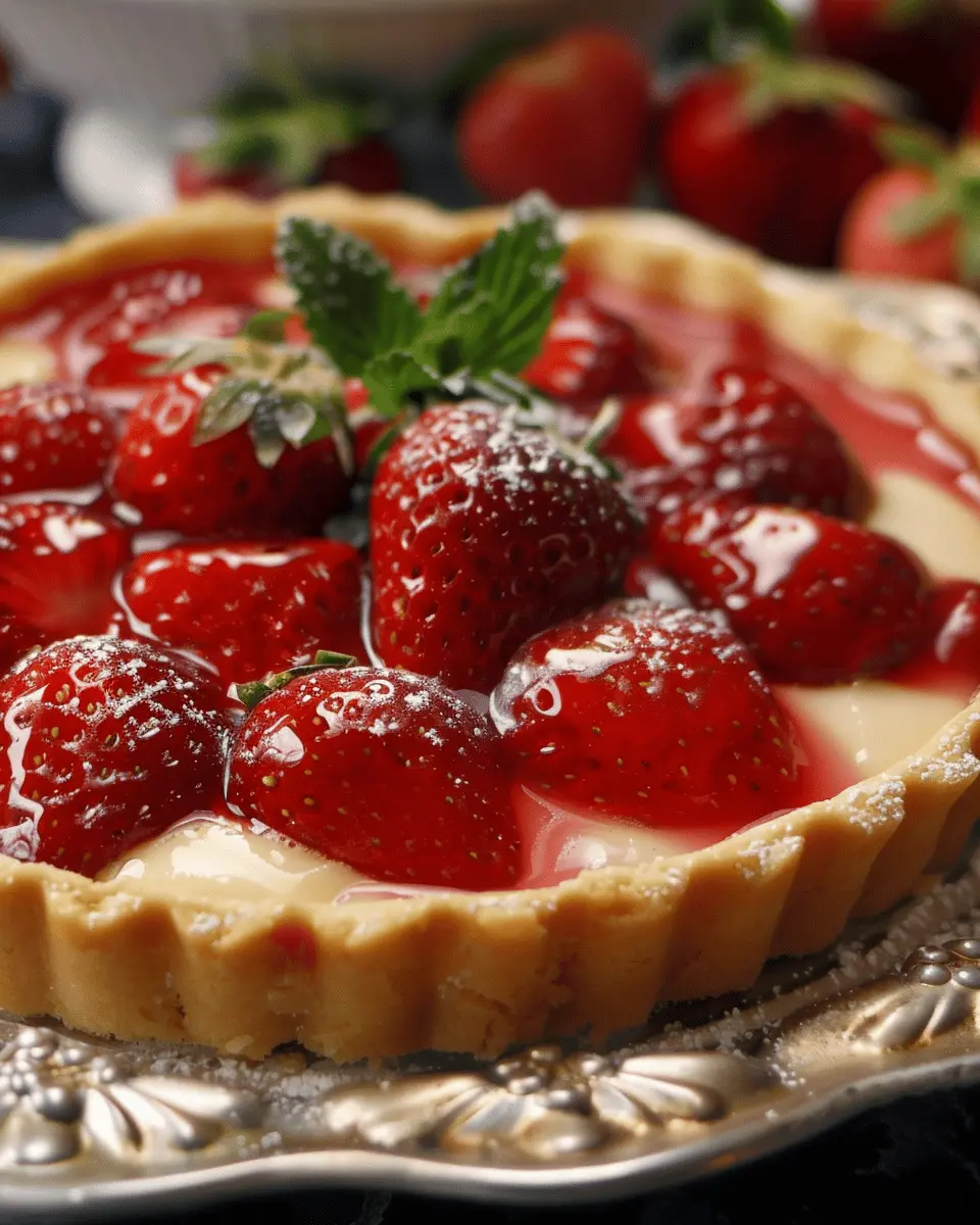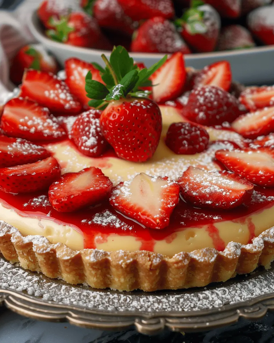 Presentation is key when serving your vanilla custard & strawberry tart. Start with a clean, white plate that allows the vibrant strawberries to pop. You could dust the tart lightly with powdered sugar for an elegant touch. Add a dollop of whipped cream alongside, perhaps garnished with a fresh mint leaf for color. To create a little magic, a drizzle of chocolate sauce or berry coulis can draw the eye and delight your guests. A beautiful presentation makes the experience not just tasty, but memorable.